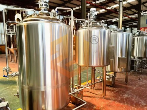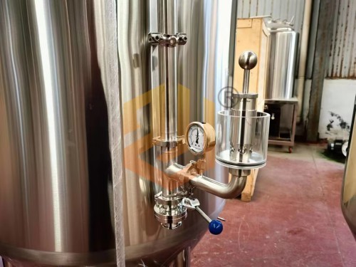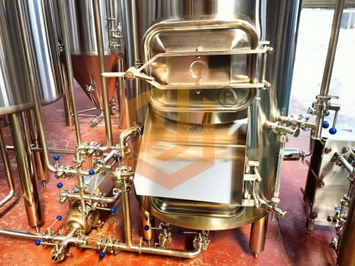精釀啤酒設備使用的過濾槽與旋沉罐:采用上下兩層的設計方式,整體占地面積小,過濾槽采用銑制篩闆,頂部采用異型人孔設計,側面配有出糟口,方形人孔門設計更有利于啤酒麥糟的清理工作,同時還配有出糟闆。内部配有耕刀裝置,用于疏松麥糟層以及出糟使用。